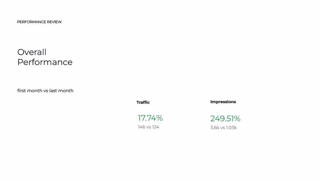 - Objective: Increase visibility by 20%.- Result: Increased search visibility (impressions) by 120% (2.2k vs 998) in the last 28 days.